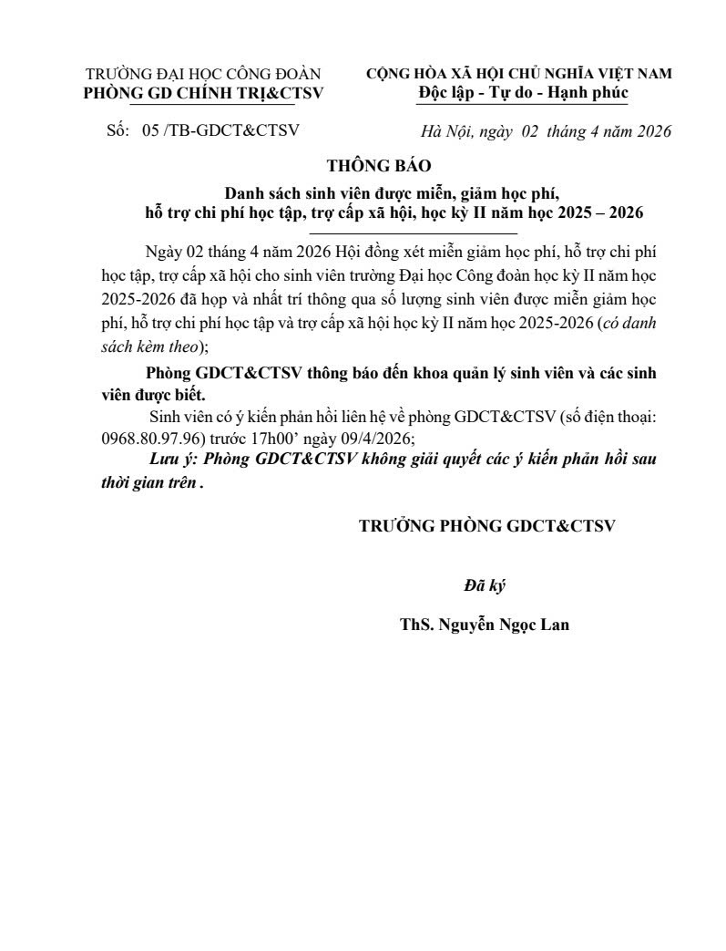 DANH SÁCH SINH VIÊN ĐƯỢC MIỄN GIẢM HỌC PHÍ, HỖ TRỢ CHI PHÍ HỌC TẬP, TRỢ CẤP XÃ HỘI HỌC KỲ II NĂM HỌC 2025-2026
