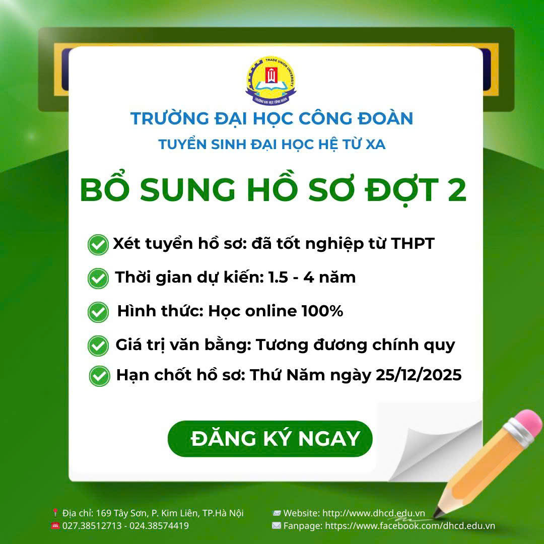Trường Đại học Công Đoàn thông báo tiếp tục nhận hồ sơ tuyển sinh Đại học Hệ Từ Xa – Đợt 2. Đây là cơ hội cuối cùng trong năm dành cho thí sinh mong muốn sở hữu bằng Cử nhân có giá trị tương đương chính quy, phù hợp đặc biệt với người đang đi làm.