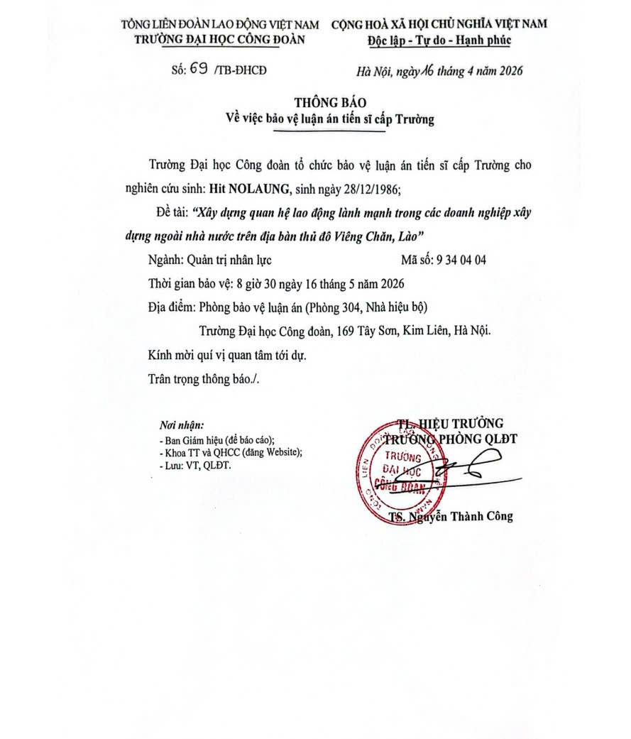 ĐIỂM MỚI LUẬN ÁN TIẾN SĨ HIT NOLAUNG (TIẾNG ANH): Xem tại đây