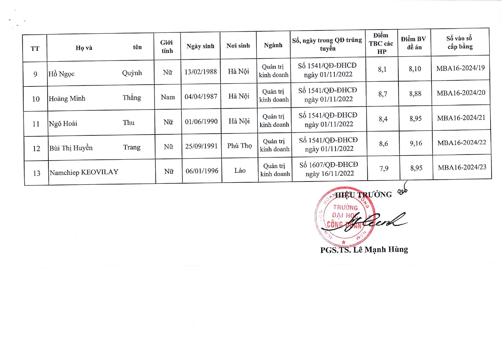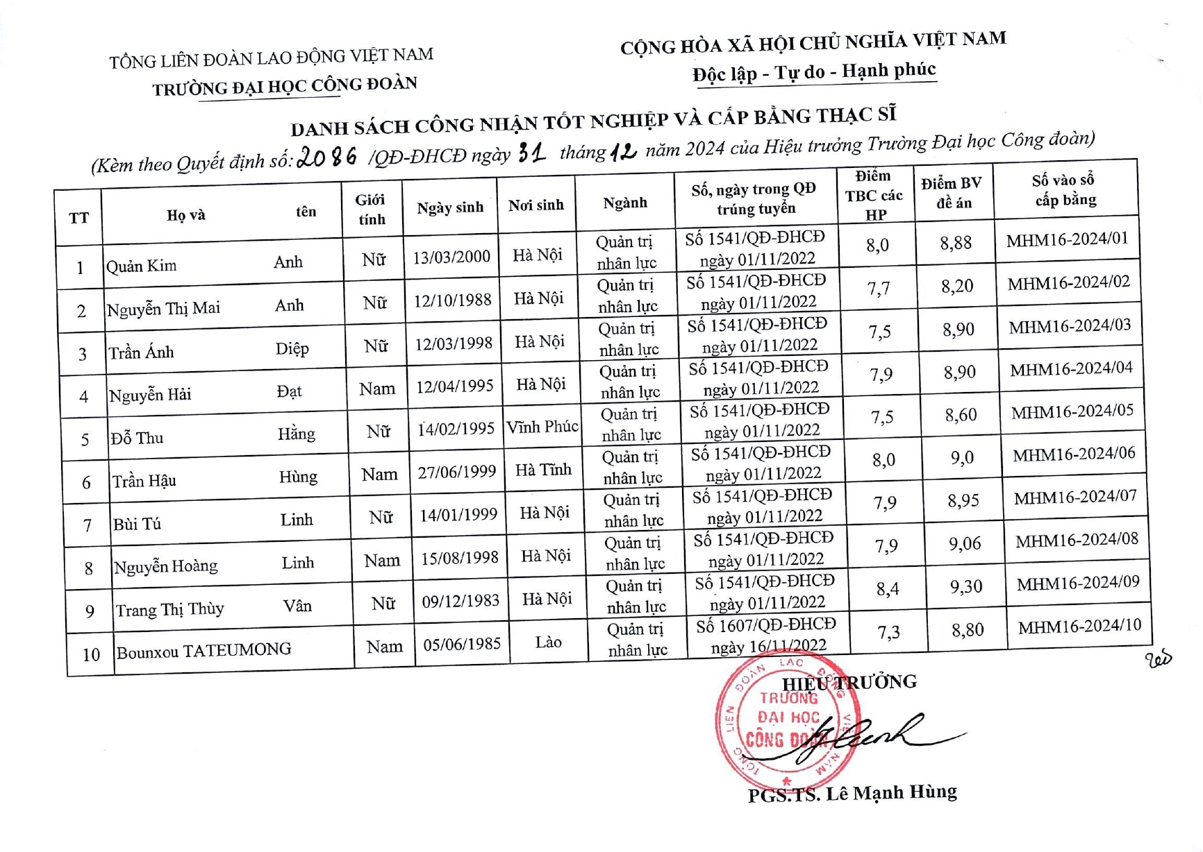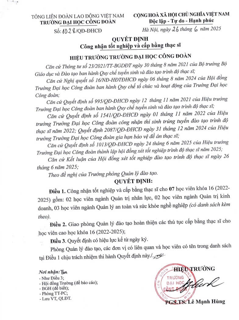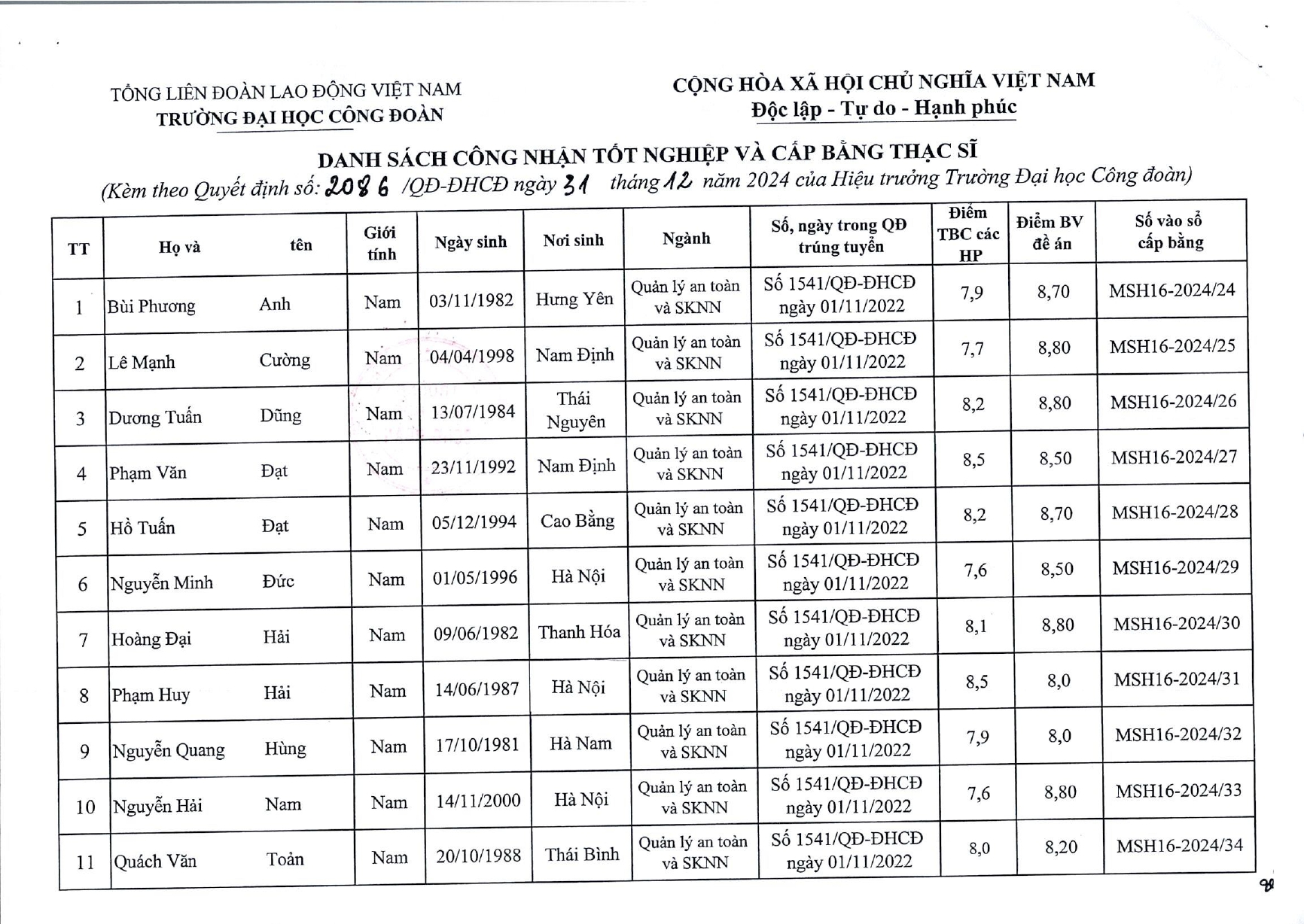 QUYẾT ĐỊNH CÔNG NHẬN VÀ CẤP BẰNG THẠC SĨ CH16