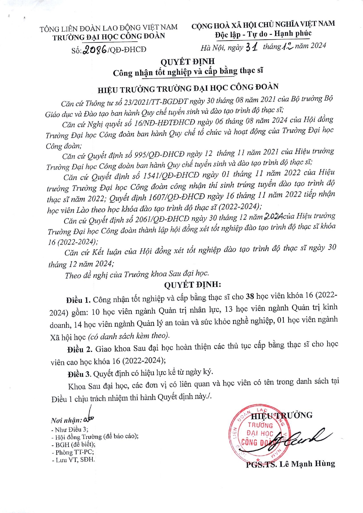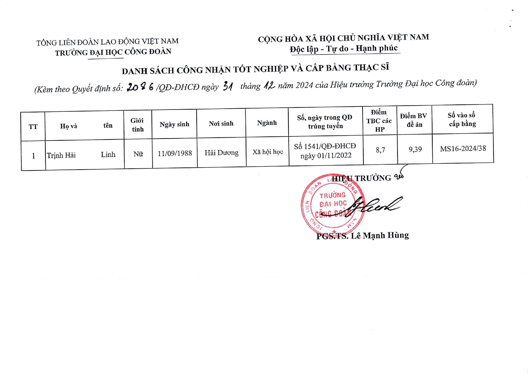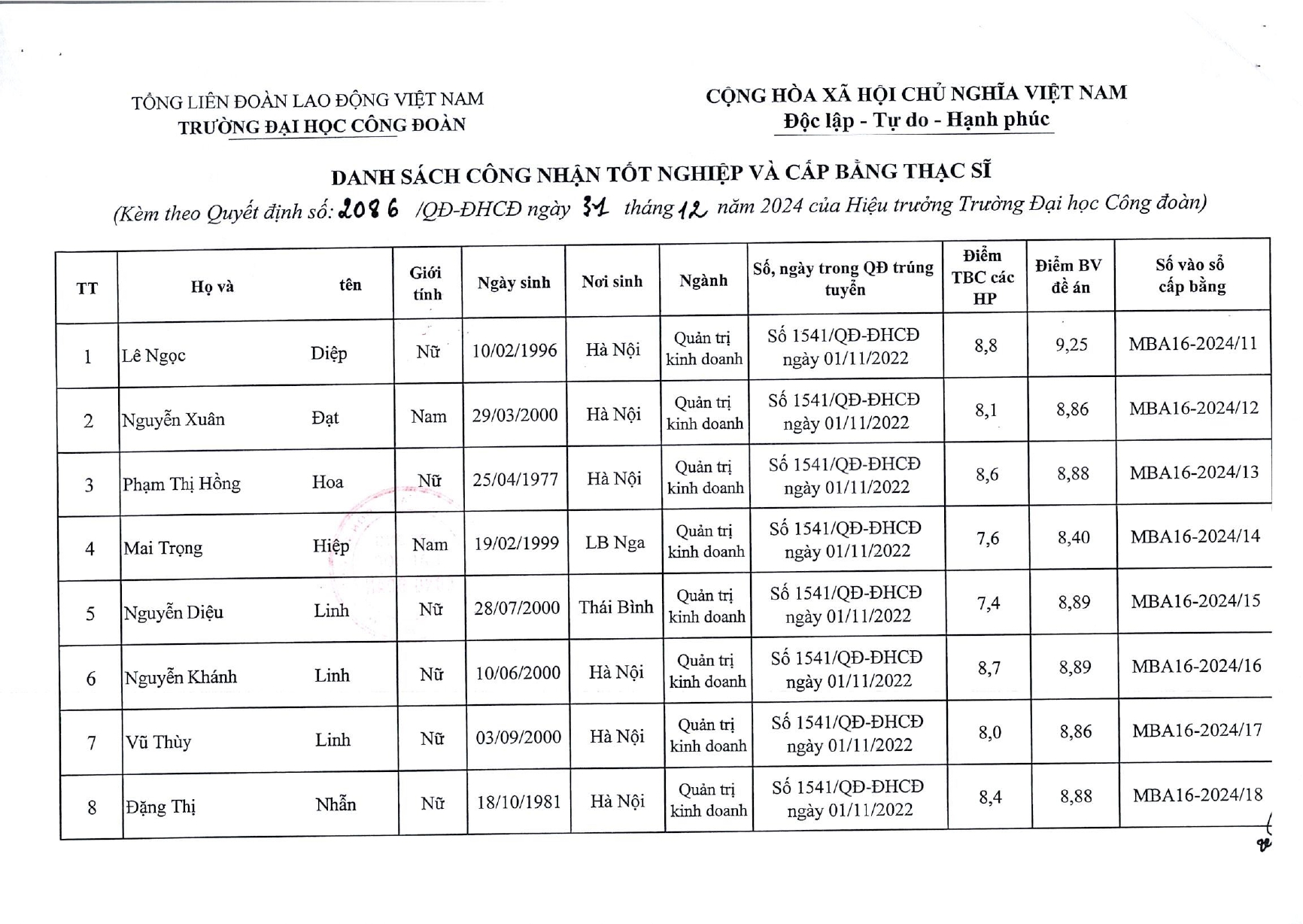 QUYẾT ĐỊNH CÔNG NHẬN VÀ CẤP BẰNG THẠC SĨ CH16