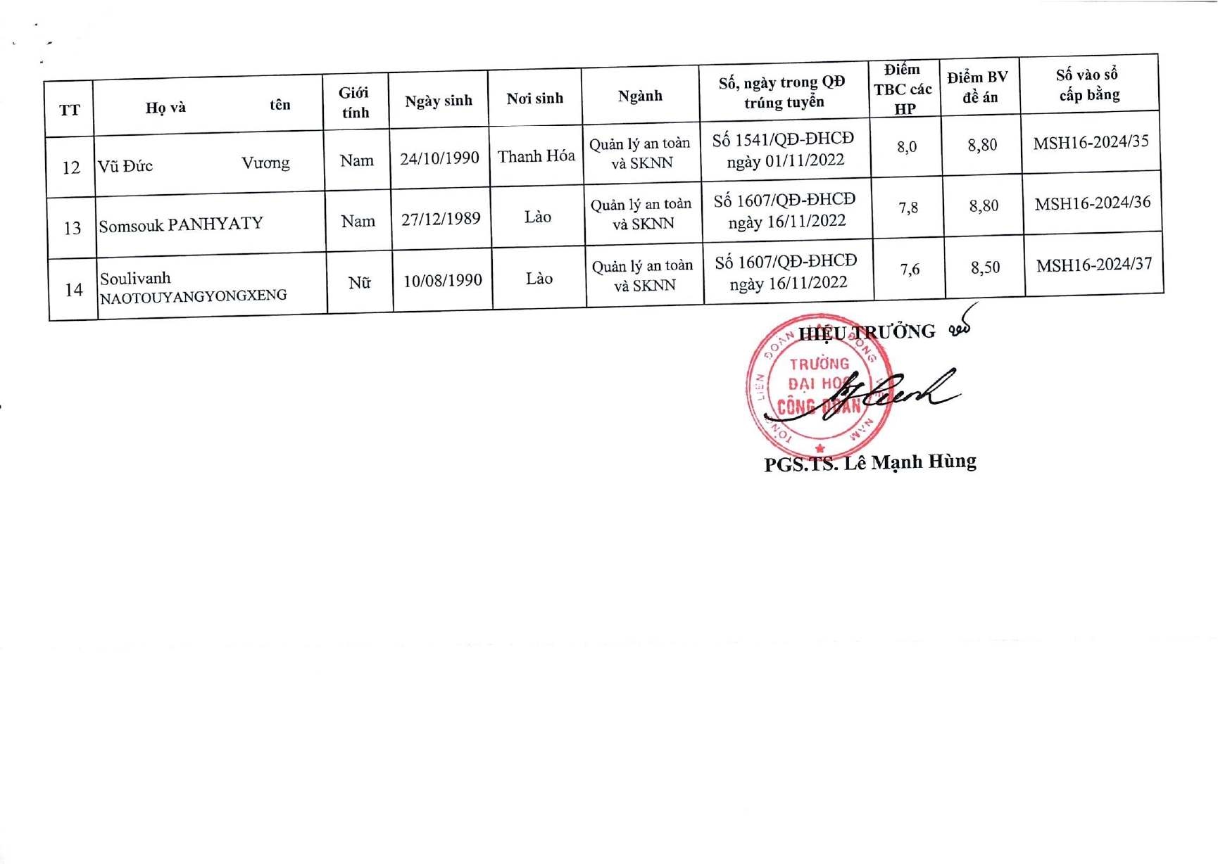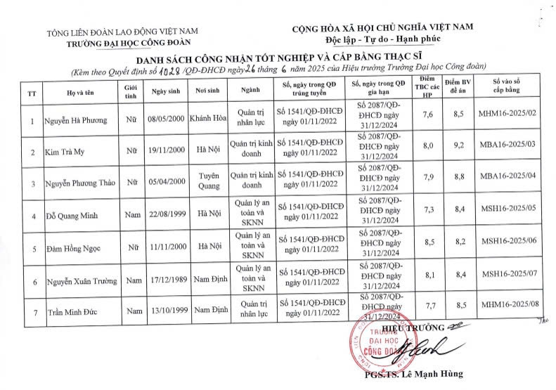 Danh sách học viên, sinh viên tốt nghiệp